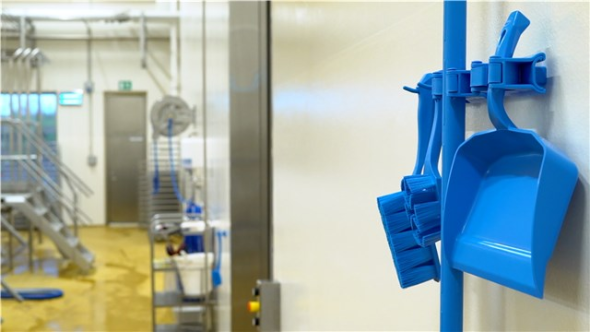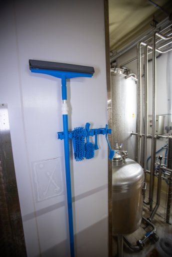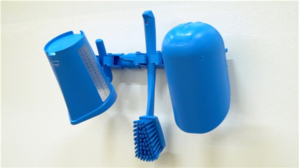Higieniczny, modułowy wspornik ścienny, który zapewnia elastyczne rozwiązanie do przechowywania narzędzi i przyborów do czyszczenia w dowolnym miejscu.