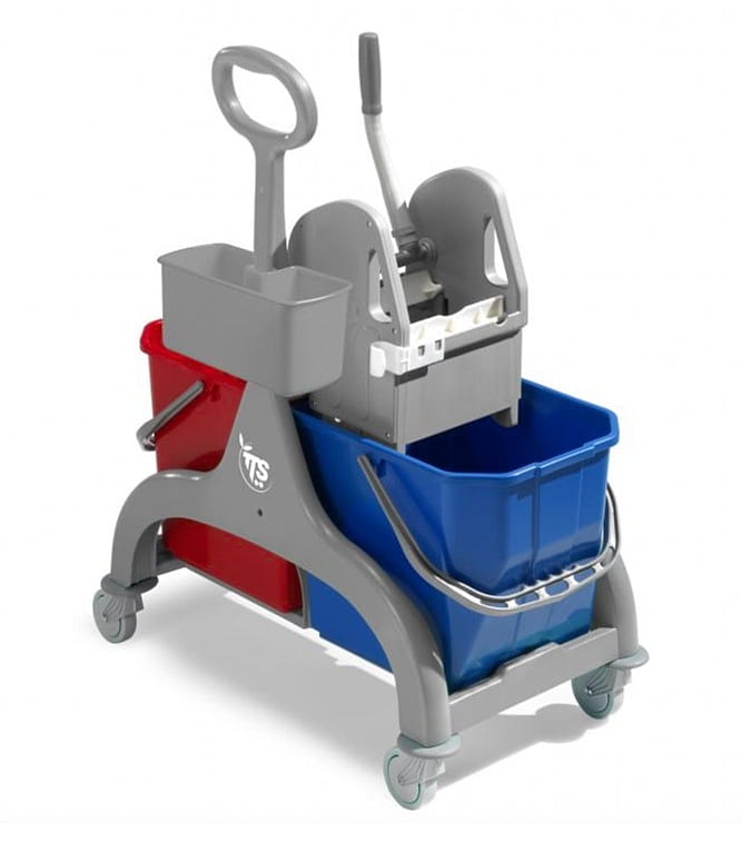 Wózek do sprzątania z podwójnymi wiadrami i profesjonalną wyciskarką szczękową. Idealny do czyszczenia średnich i dużych powierzchni, w których konieczne jest płukanie mopa.