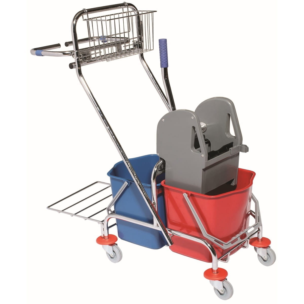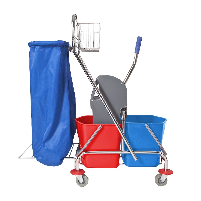 Wózek z podwójnym wiadrem do sprzątania i mycia podłóg. Wyciskarka szczękowa pozwala na sprawne usuwanie nadmiaru wody z mopa. Wyposażony w 4 gumowe koła skrętne. Idealny do profesjonalnego użytku. Dodatkowo wózek posiada uchwyt na worek na śmieci oraz koszyk na akcesoria.
