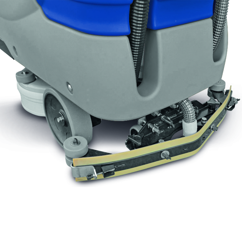 Maszyna zasilana jest bateriami 24 V i wyposażona w napęd trakcyjny na tylne koła, co zapewnia komfortową pracę operatora oraz łatwe manewrowanie nawet w ograniczonej przestrzeni. Zespół szorujący składa się z dwóch przeciwbieżnych szczotek tarczowych napędzanych niezależnymi motoreduktorami, gwarantując dokładne usuwanie zabrudzeń oraz równomierne czyszczenie posadzki.