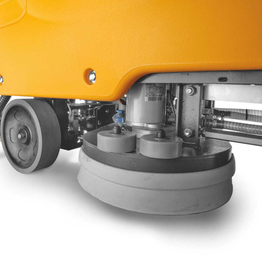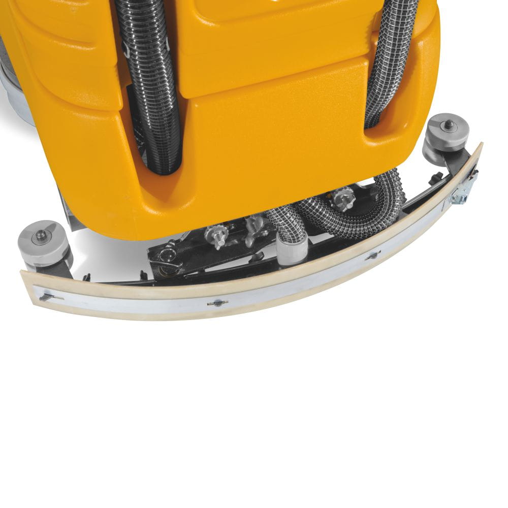 Zespół myjący wyposażony w dwie przeciwbieżne szczotki napędzane niezależnymi motoreduktorami gwarantuje cichą pracę oraz wysoką skuteczność czyszczenia. Innowacyjna, łukowa ssawa typu „low chamber” zwiększa podciśnienie w komorze zbierającej, zapewniając bardzo dobre osuszanie posadzki również podczas jazdy oraz eliminując kapanie wody po zakończeniu pracy.